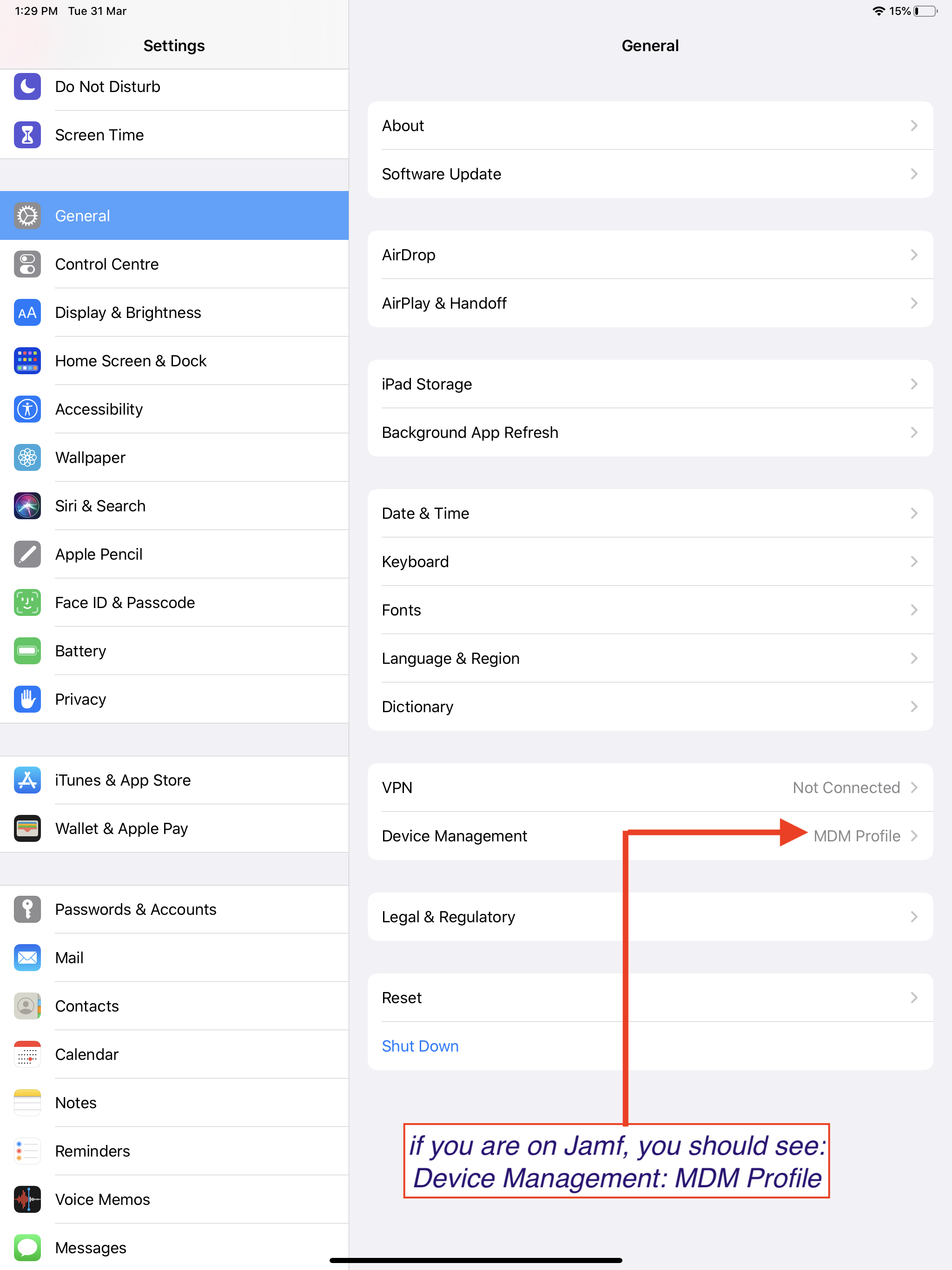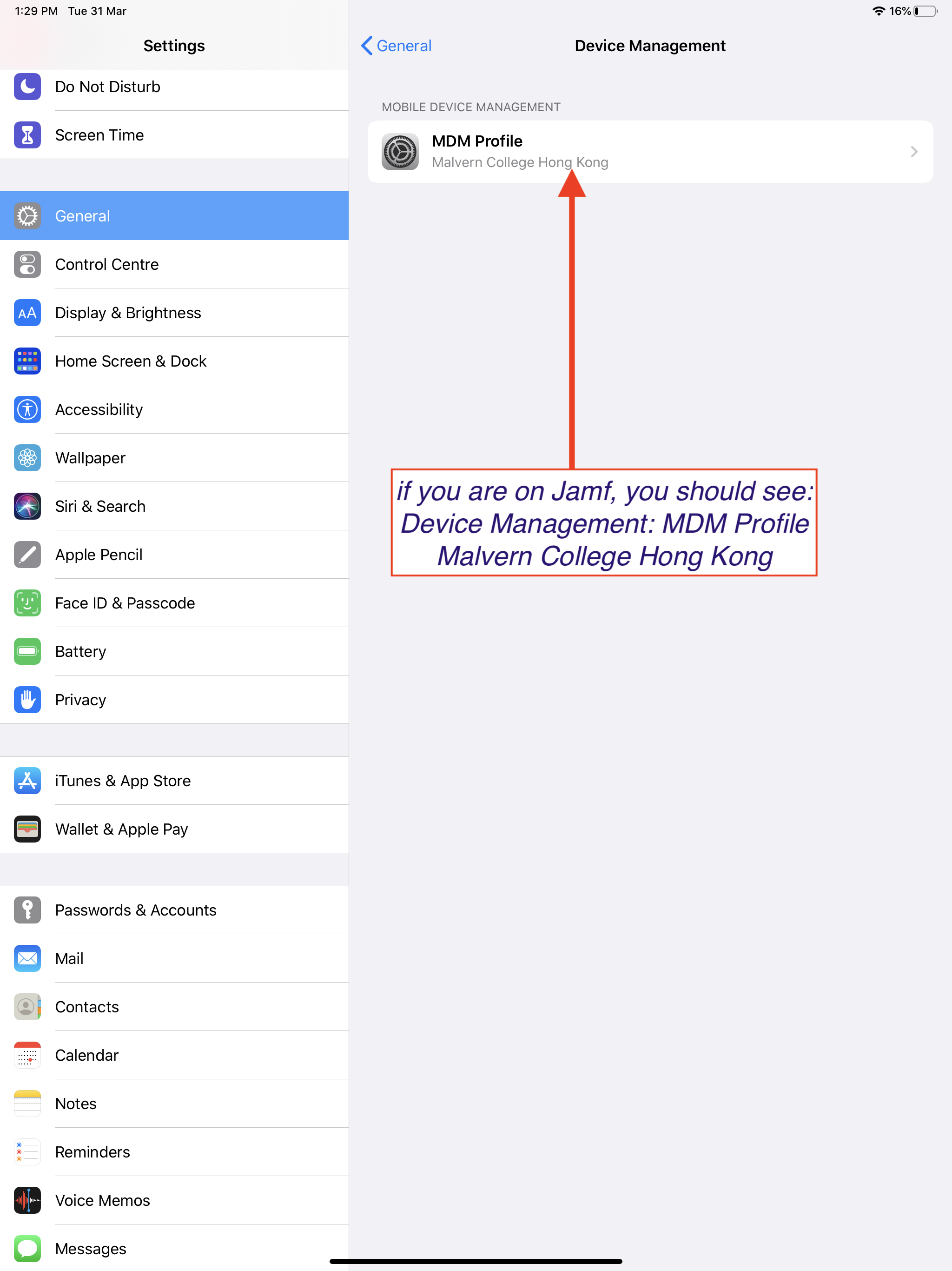 If you do not see the Device Management: MDM Profile setting, you may need to enroll your iPad to our Jamf system.