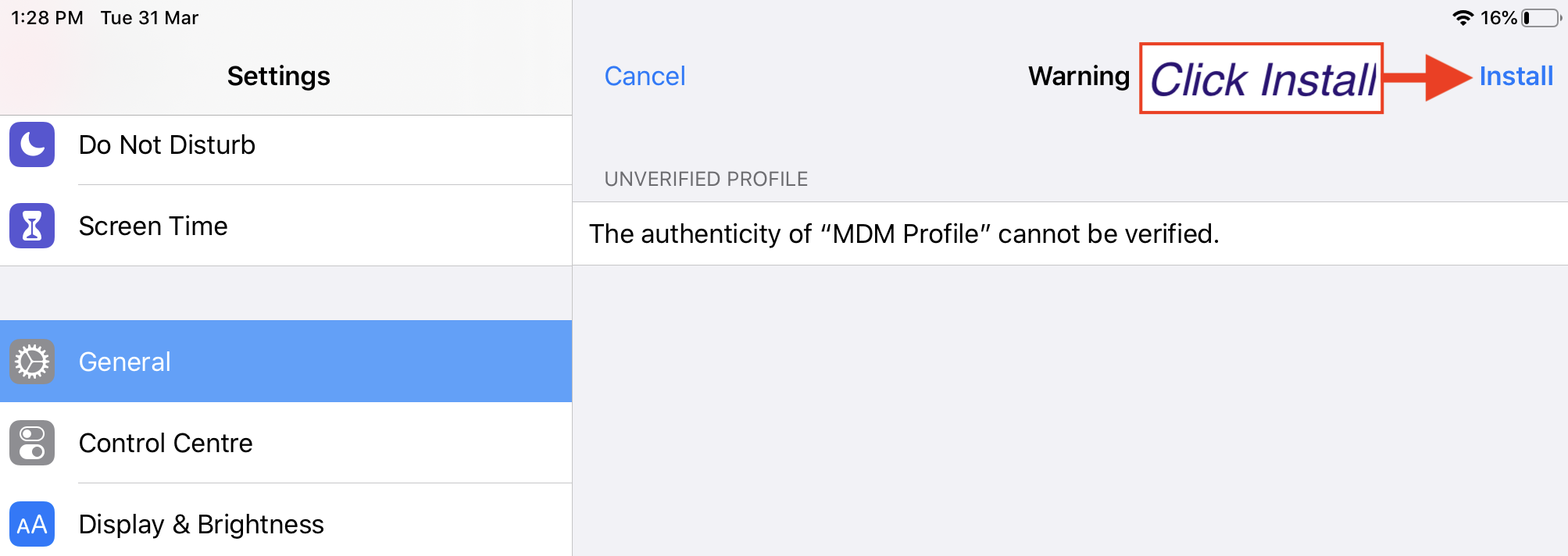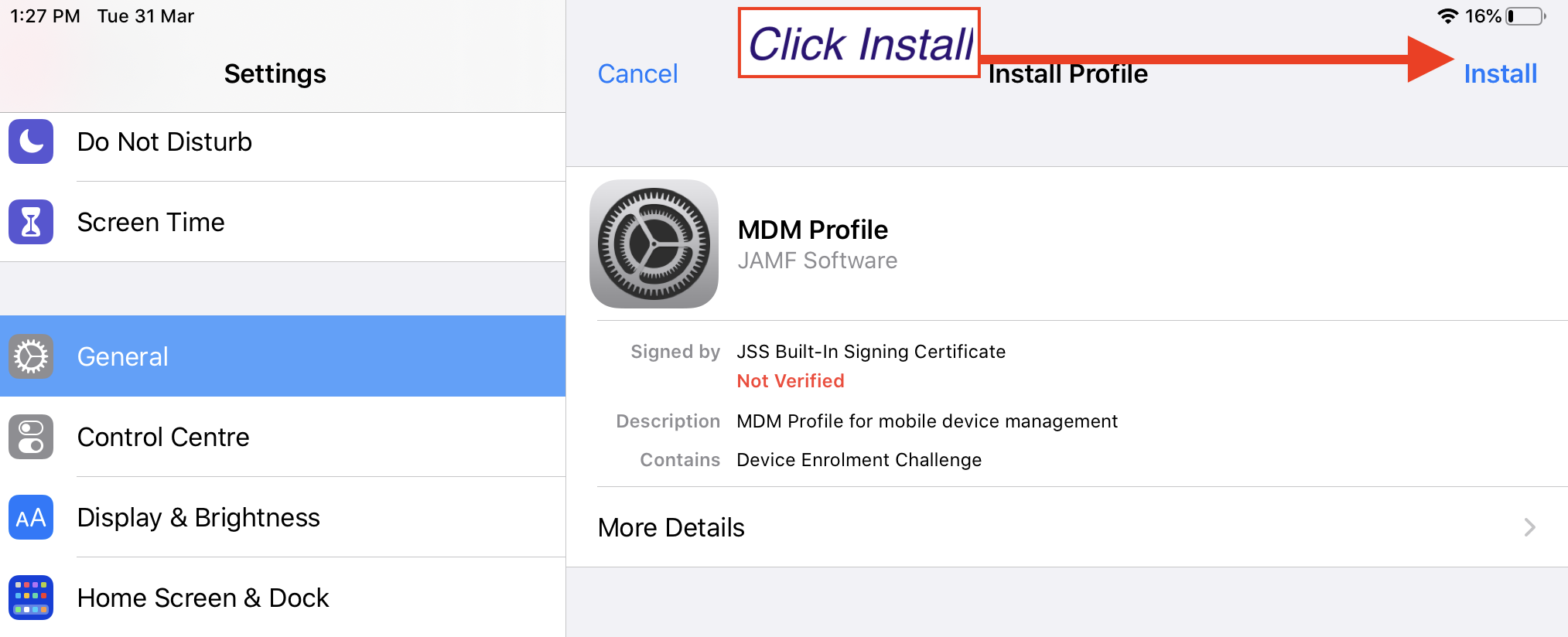 15. Please also remember to click "Install" for each app deployed to your iPad through the MDM profile.
