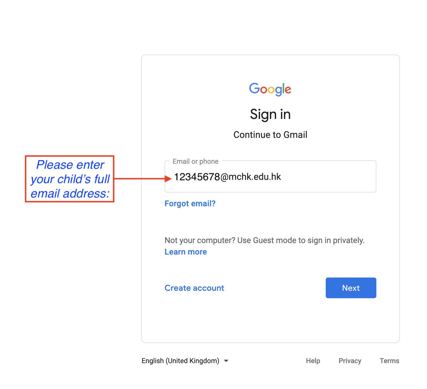 2) enter your child's full email address: 12345678@mchk.edu.hk