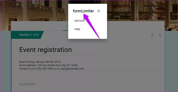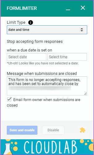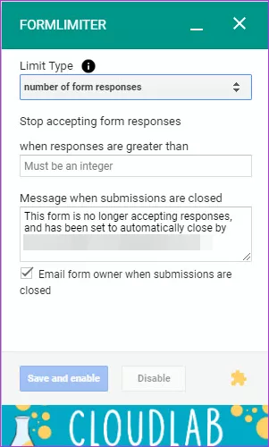 The aptly-named formLimiter add-on brings plenty of customization features to the humble 'Accepting responses' switch of Google Forms. With it, you can limit the number of responses and specify the date & time after which the form will stop accepting responses. Nifty, right?