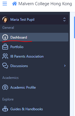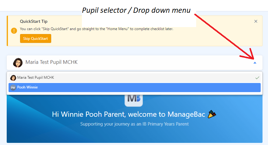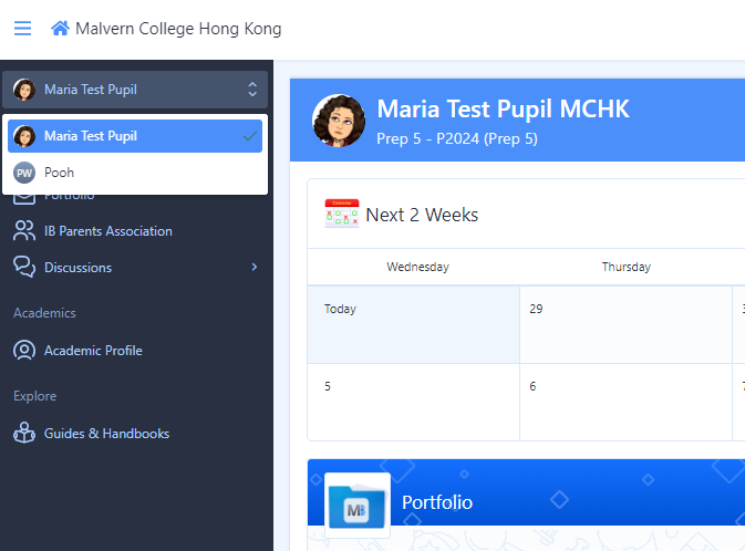 After logging into ManageBac, you can select between your children using the drop-down selector at the top of the screen.